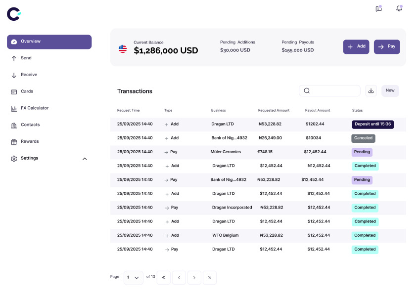 Send and collect funds across Africa and global markets with clear pricing, next-day settlement, and world-class compliance.