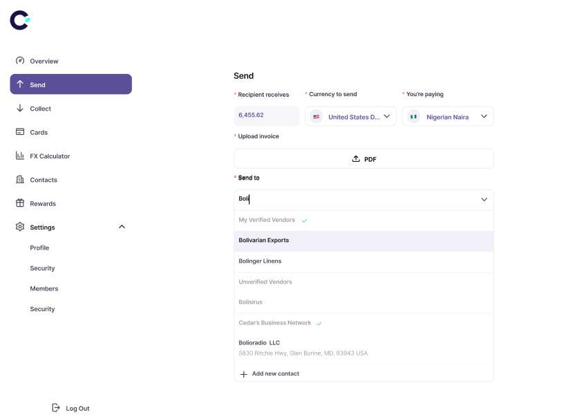If you operate in agriculture, consumer goods, manufacturing, or technology and rely on global suppliers, Cedar enables you to make cross-border payments within 24 hours, without inflated FX costs so your supply chain stays uninterrupted and your business continues to grow.